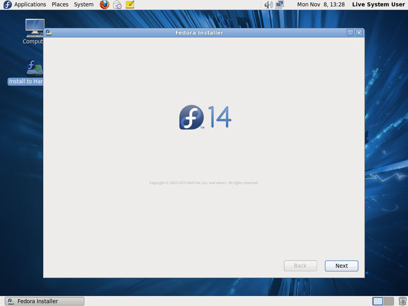 The Fedora Installer starts. Click on Next: